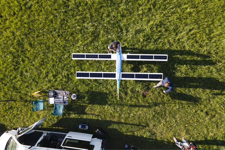 Just like a satellite, SolarXOne is packed with technologies. Half airplane, half drone, this UAV weighs 25 kg, has a 4.50 m wingspan, and is innovative in several ways:
