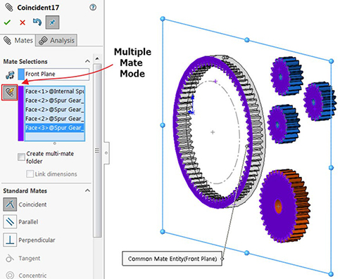 To start assembling the gear system, we will mate the back face of each gear Coincident to the Front Plane of the assembly (make sure that none of the parts are fixed in-place, if so right-click the part and select Float). To speed up this process, use the Multiple Mate Mode button, and select the Front plane as the common reference.