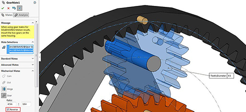 Now we are ready for the Gear mates. Select the Pitch circles drawn on each gear to define the Gear mates. This will define the gear ratios, though cylindrical faces on the gears could also be used and ratios can be manually overwritten. Add Gear mates between the three Planet gears and the Ring gear and one gear mate between a single Planet gear and the Sun gear (this is all that is needed for the complete gear motion). While making the Gear mates, be sure to test each and ensure that the spin directions are correct. Use the Reverse checkbox in the Mates Property Manager to fix if necessary. Also, do not worry about making the gear teeth mesh correctly (we will fix this next.)