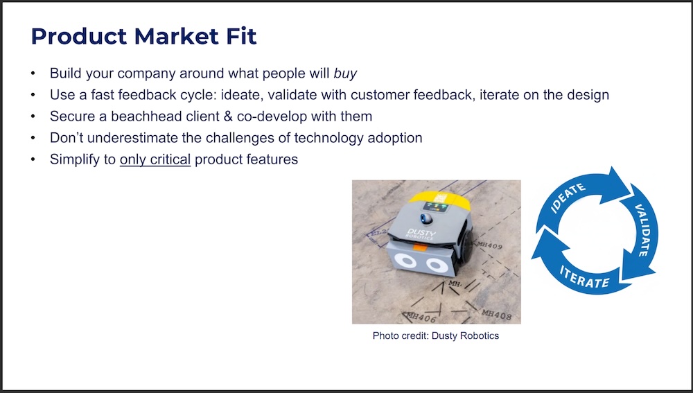 Dusty Robotics did this by interviewing clients for several months prior to building their robot. Then you need to build hardware, gather more feedback from customers, and keep iterating on the design, in fast cycles. Don’t be in stealth mode. Build in public since you don’t have multiple shots on goal. You have to know there is a market for what you are building when you go out there.