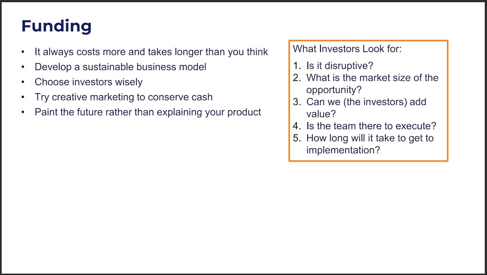 It always costs more and takes longer than you think: A common reason companies fail is that they run out of money or cannot secure their next round of funding prior to running out of cash. New entrepreneurs are often surprised by how much additional costs the business ends up having beyond what was modeled in their first business plan. After all, you’re inventing something new and disruptive that the market hasn’t seen before, so you can’t have a perfect prediction of how much it will cost. What you can have though is estimates based on previous similar projects which mentors and companies who have previously brought products to market can help estimate. Listen and learn and add contingencies to your budget for the unknown areas that could take longer than you think. It’s also easier to raise more money if you have chosen your investors wisely and they are willing to keep investing in you for future rounds.